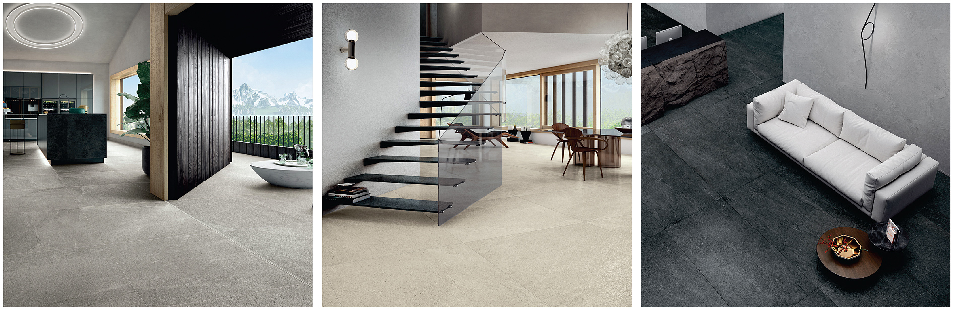 Blend Stone is a collection of stone-effect porcelain stoneware that offers more than meets the eye. By incorporating fragments that sink below the surface and combining mineral textures of rare beauty throughout the thickness of the ceramic slab, Blend Stone creates a new material. Composed of three graphic textures obtained from as many natural stones, Blend Stone adds rust-colored inclusions to the typical grain of Limestone and the halos of Pietra Piasentina overlaps dark segments and light and delicate veins.